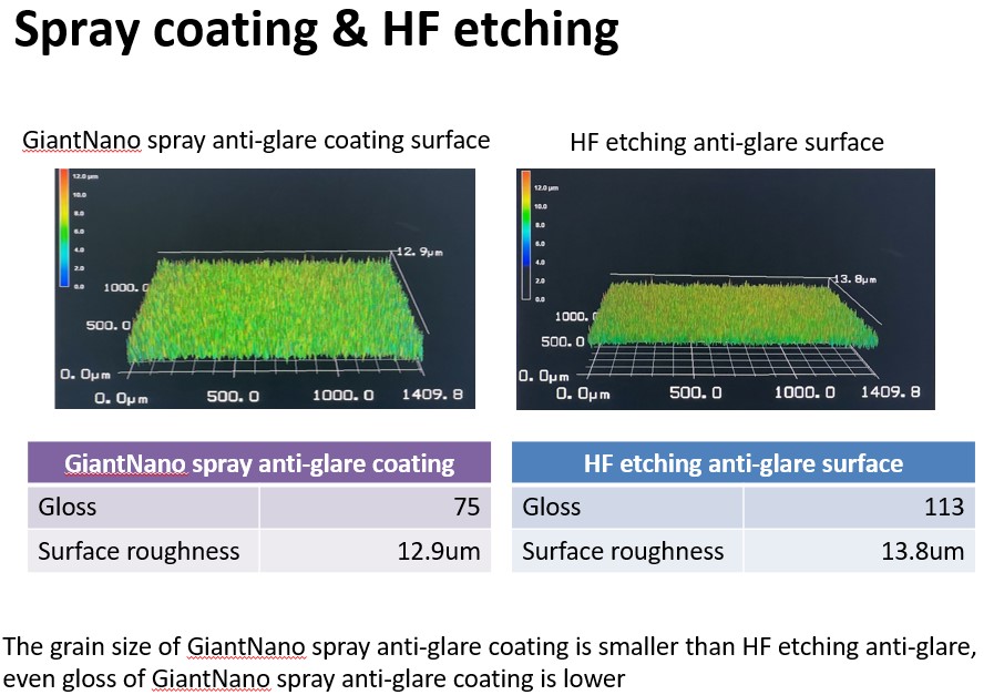 本公司提供的AG材料,可直接噴塗於玻璃表面,硬度高達7H,表面滑順度比玻璃表面更高。另外可依照客戶所需,同時提供高水接觸角與低水接觸角,以及不同霧度、不同光澤度。